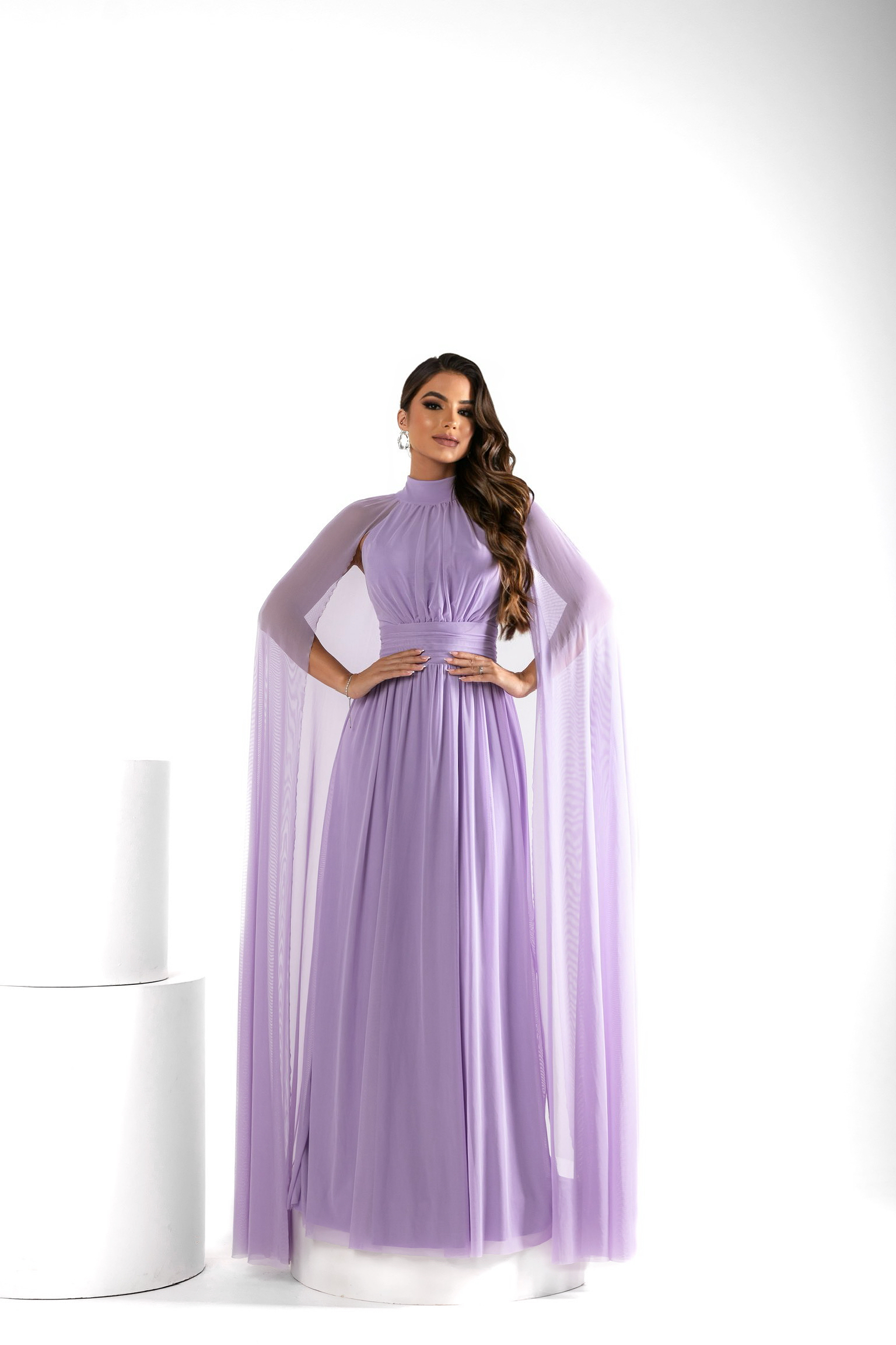 Vestido de festa de gola e capa que exala sofisticação e elegância.
