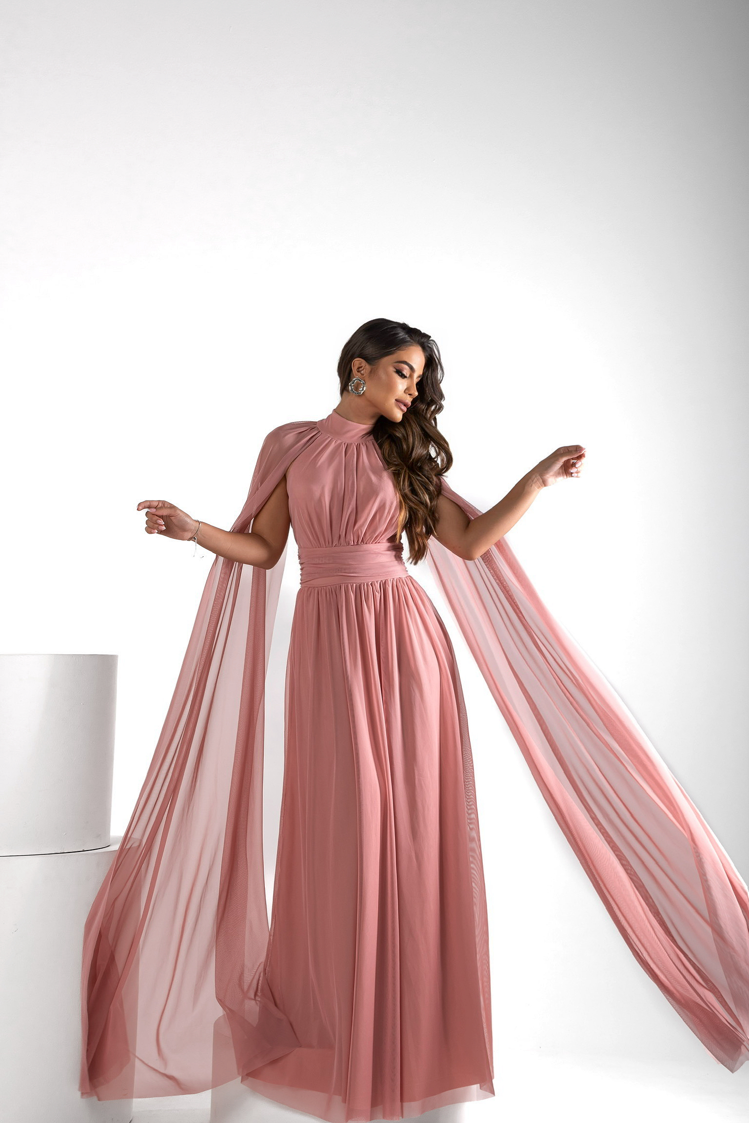 Vestido de festa de gola e capa que exala sofisticação e elegância.