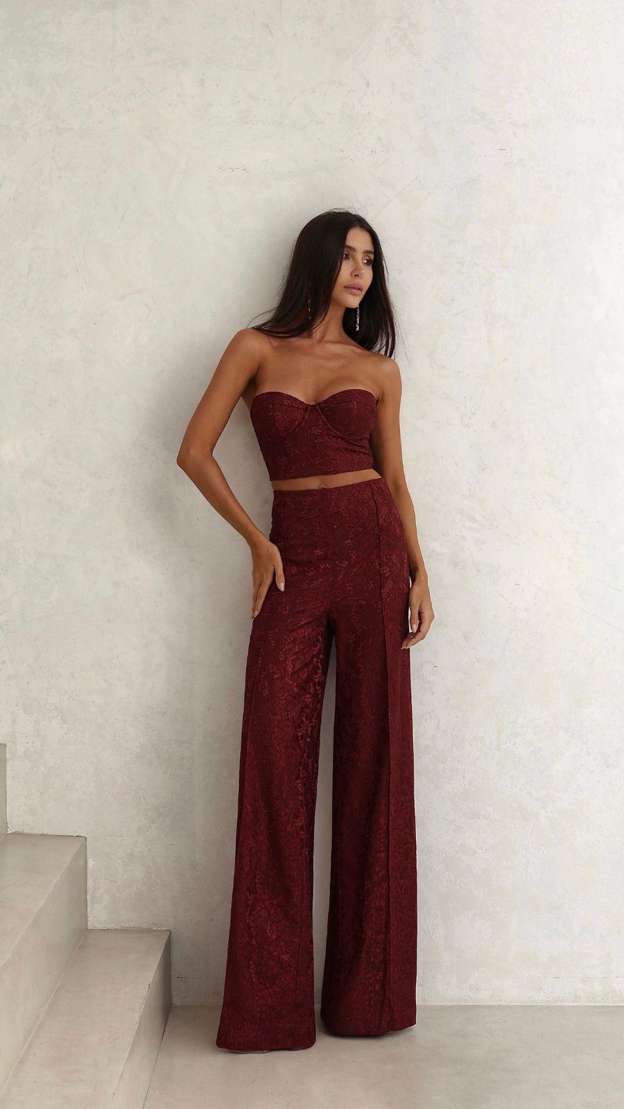 Composto por calça pantalona de caimento fluido, garantindo sofisticação e movimento.