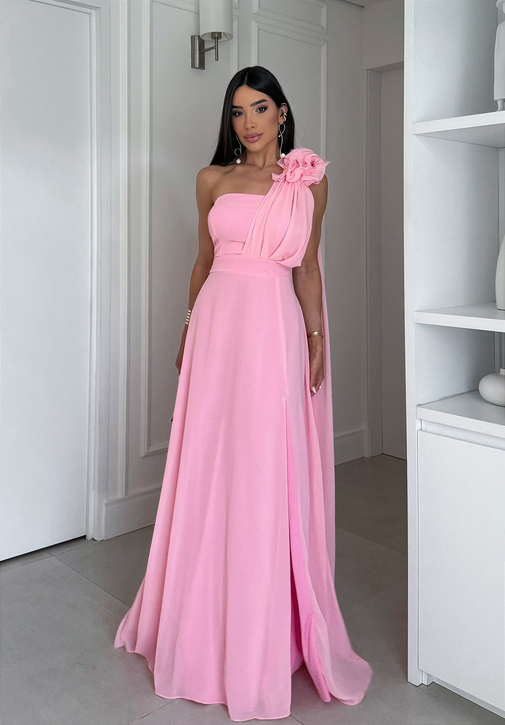 Esse vestido longo é ideal para ocasiões especiais que pedem uma peça elegante e confortável. O chiffon rosa destaca-se pelo toque suave e aparência delicada, valorizando a silhueta com caimento perfeito. A parte forrada garante segurança sem perder a leveza e o charme do vestido.